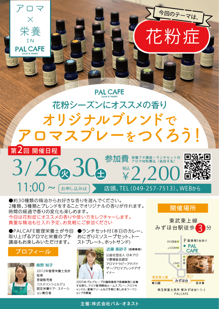 オリジナルのアロマと栄養のワークショップを開催 心地よい香りで気分を前向きに 富士見市みずほ台にあるPALCAFE(パルカフェ)では、当社所属のアロマテラピーアドバイザー・アロマデザイナーが、カフェの雰囲気を楽しみながらオリジナルのアロマを楽しん... -